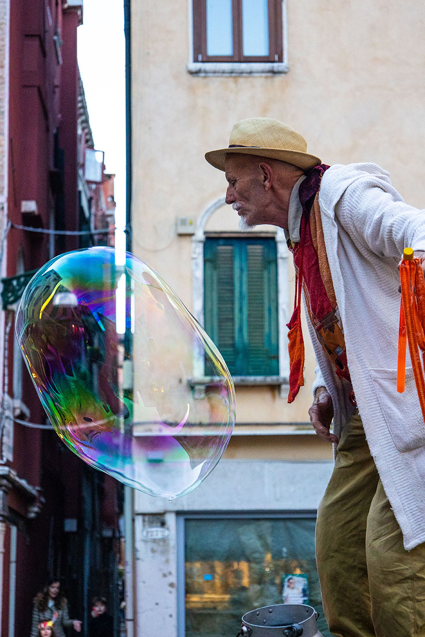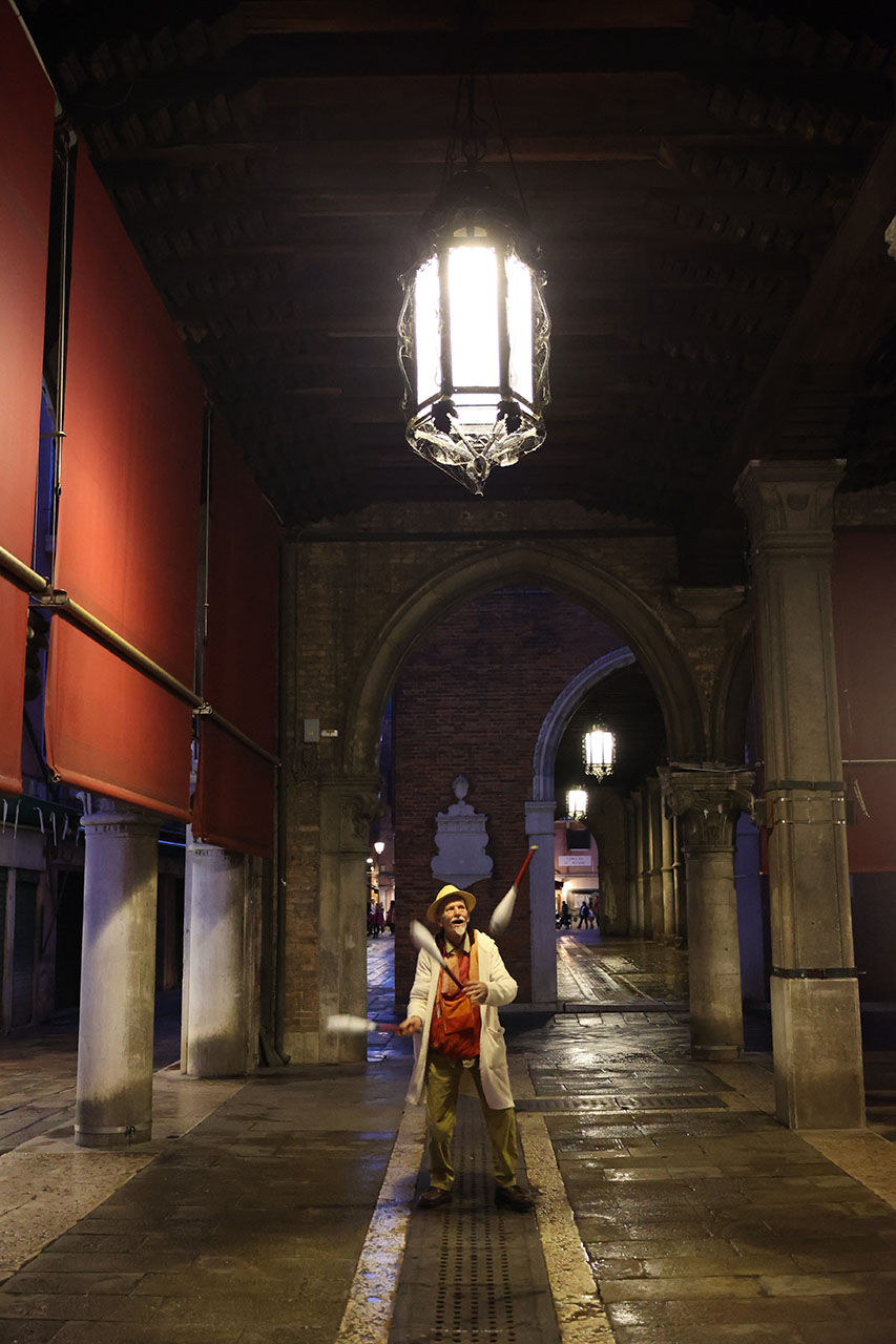 Tra una potatura e una consulenza, tra una vendemmia e una fiera vinicola, Gigi anima strade e piazze con numeri da saltimbanco e giochi di fuoco.